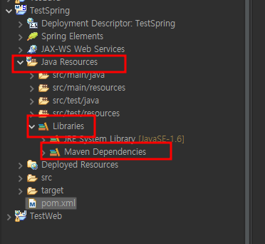 라이브러리 추가시 pom.xml 에서 확인가능, 우리는 따로 추가해준건 없어, 기본적으로 Maven Dependencies 잡힘