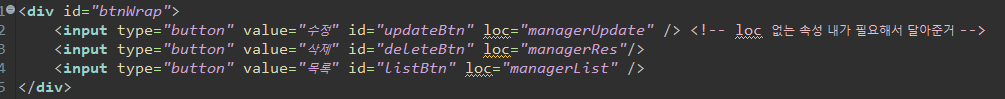 <input type="button" value="수정" id="updateBtn" loc="managerUpdate" /> <!-- loc 없는 속성 내가 필요해서 달아준거 -->
