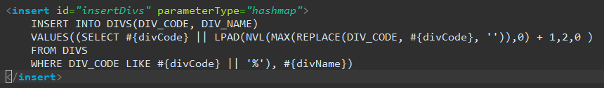 VALUES((SELECT #{divCode} || LPAD(NVL(MAX(REPLACE(DIV_CODE, #{divCode}, '')),0) + 1,2,0 )