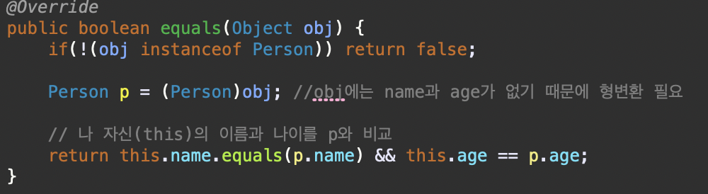 Person p = (Person)obj; //obj에는 name과 age가 없기 때문에 형변환 필요