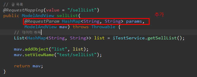 public ModelAndView sellList(@RequestParam HashMap<String, String> params, ModelAndView mav) throws Throwable {