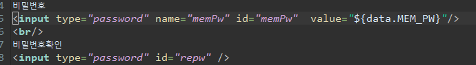 <input type="password" name="memPw" id="memPw" value="${data.MEM_PW}"/>