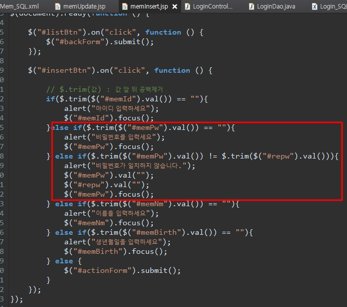 } else if($.trim($("#memPw").val()) != $.trim($("#repw").val())){