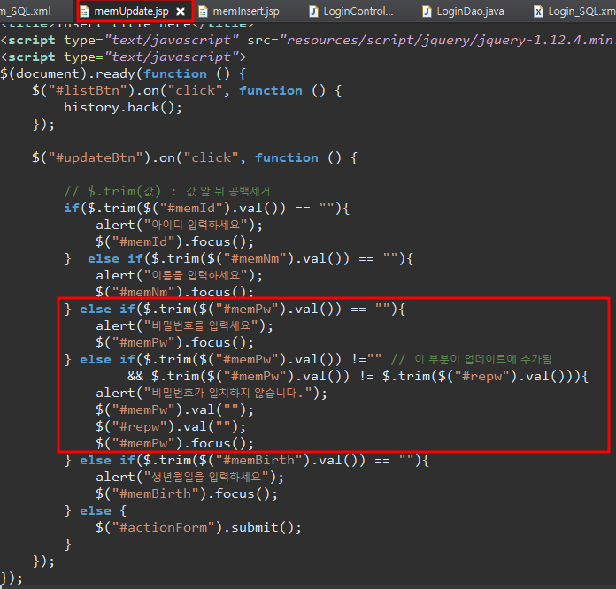 } else if($.trim($("#memPw").val()) !="" // 이 부분이 업데이트에 추가됨