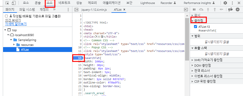 개발자 도구에서 줄 찍으면은 옆에 중단점(브레이크 포인트)가 생김