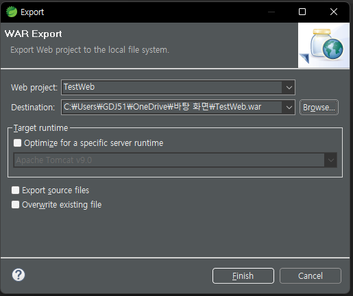 Export source files => 소스 파일을 같이 내보낼건지, 순수하게 자바파일, 배포할때는 소스파일 체크 X, 보완문제도 있고