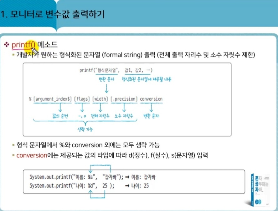 System.out.printf("이름: %1$s, 나이: %2$d", "김비자", 25); -> 이름: 김비자, 나이: 25