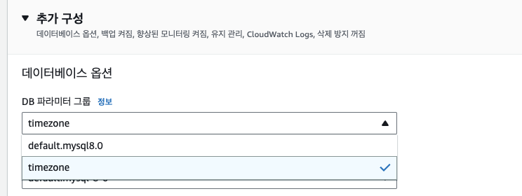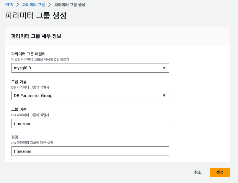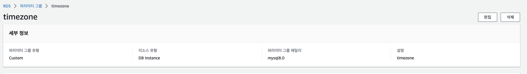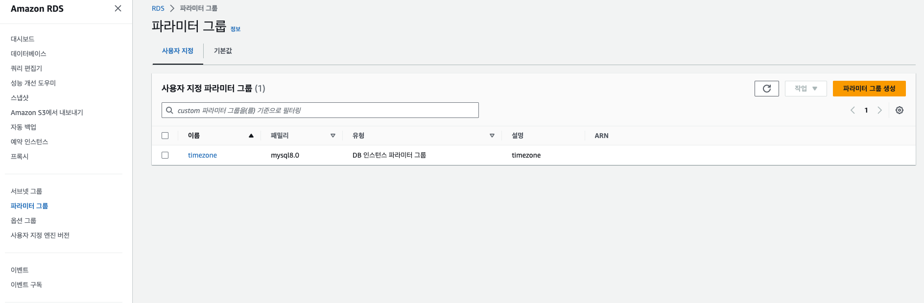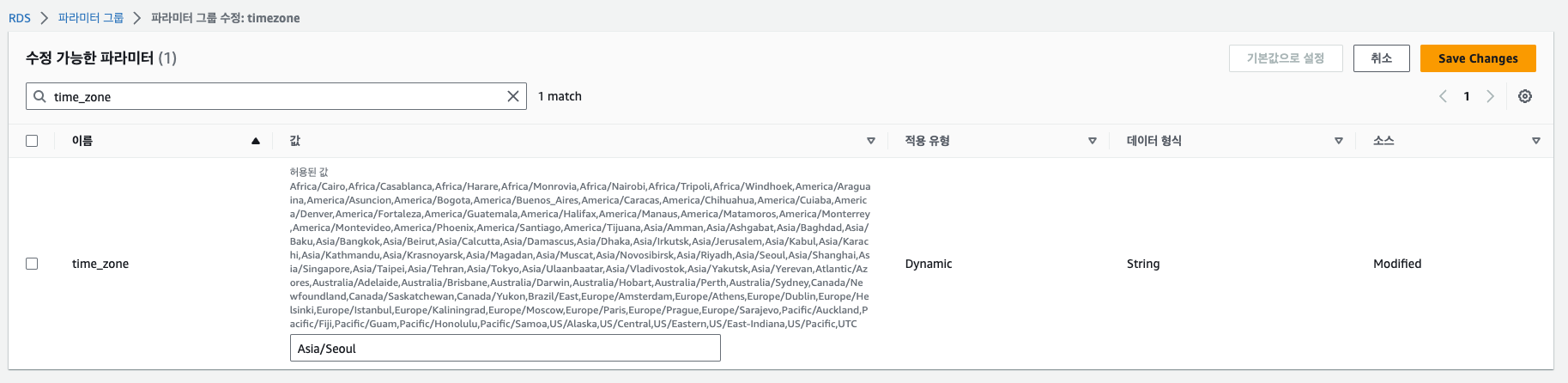 파라미터 그룹 생성 -> 파라미터 그룹 설정 변경(timezone 변경) -> 해당 DB에 생성한 파라미터 그룹 설정