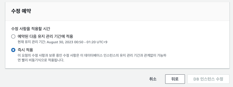 즉시 적용 선택후 DB 인스턴스 수정을 클릭한다