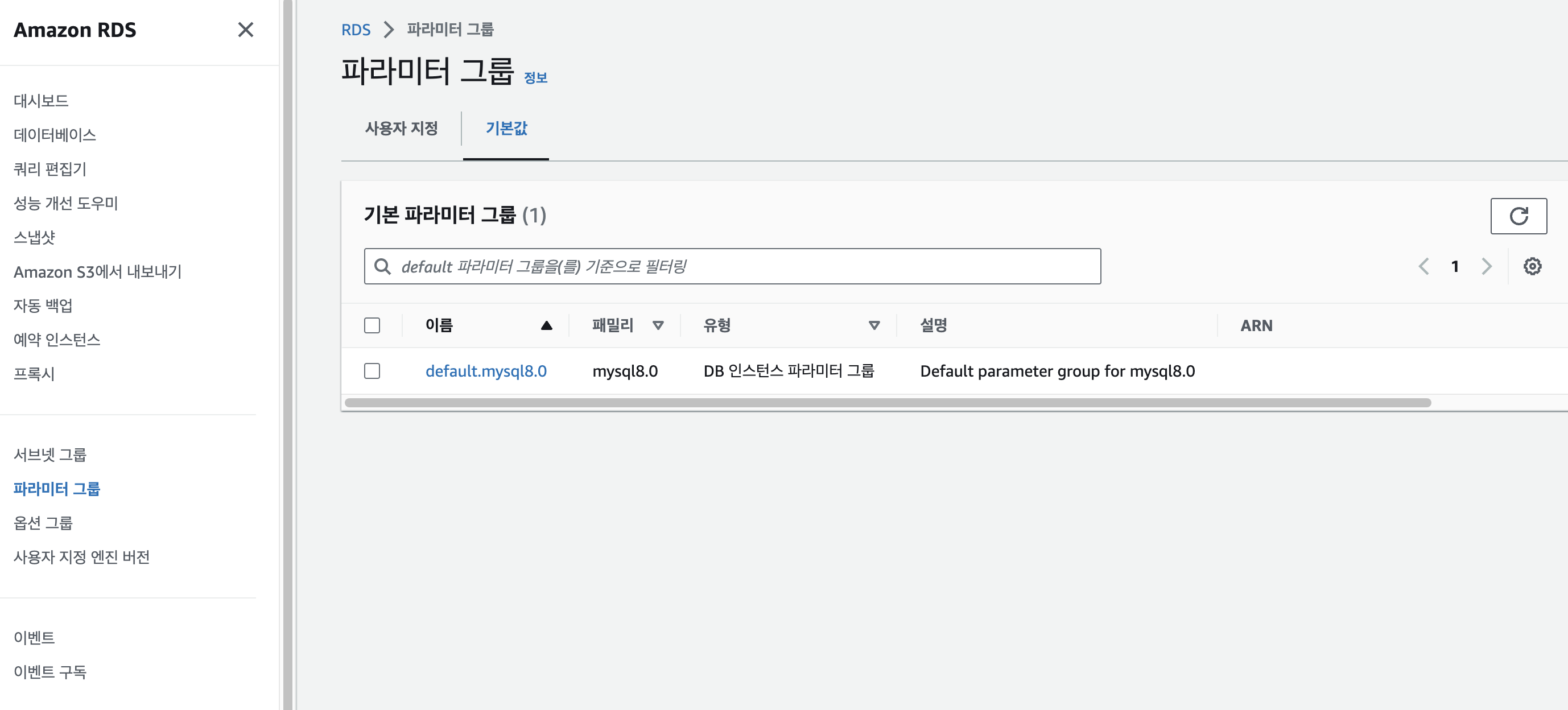 default 파라미터는 변경이 불가능하기 떄문에 파라미터 그룹에 새로 생성해 주어야 한다