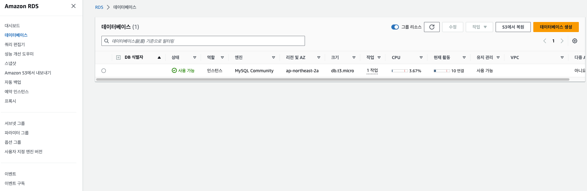 우선 aws 접속 후 RDS 서비스로 이동한다
