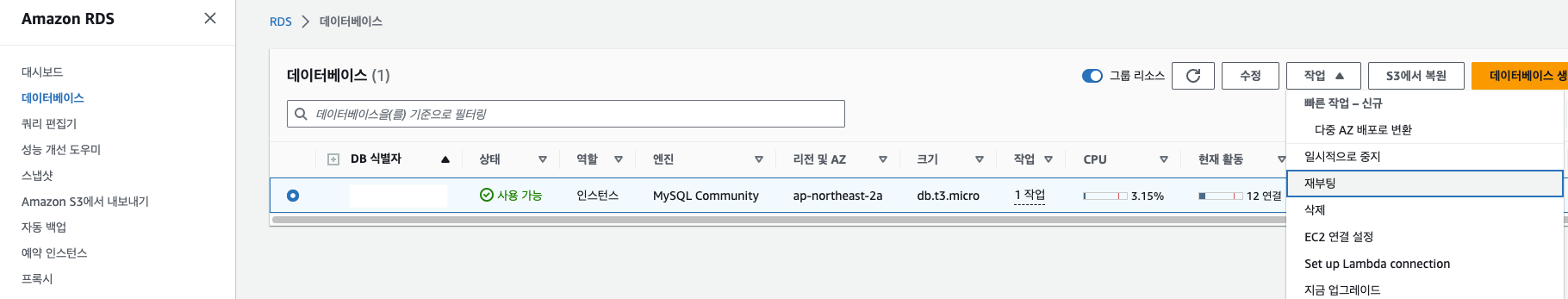혹시 파라미터 그룹 옆에 재부팅 보류 중 이렇게 뜬다면 수동으로 데이터베이스를 재부팅해줘야 한다