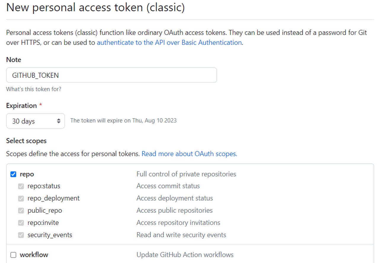 Github 사용자 아이콘 클릭 → Settings → 왼쪽 아래 Developer settings → Personal access tokens → Tokens (classic) → Generate new token → (classic) 선택 → Expiration 30 days, repo만 체크하여 Generate token → 복사하기