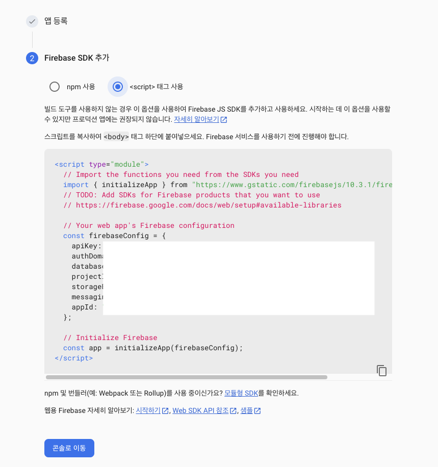 firebaseConfig는 추후 js 파일에 넣어줄 예정