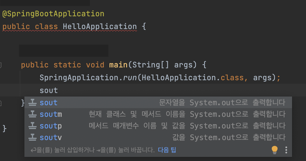 위의 사진처럼 sout 입력하고 엔터 치면 System.out.print()가 자동으로 생성된다!