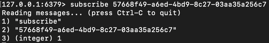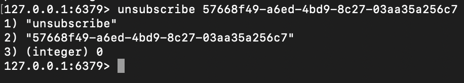 다른 터미널에서 publish 57668f49-a6ed-4bd9-8c27-03aa35a256c7 Hello 로 메세지를 보내면 구독한 터미널에 바로 메세지가 가는걸 확인할 수 있다