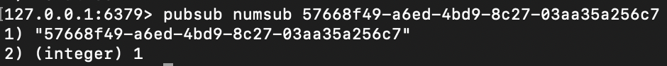 채널을 만들어 주고, 구독한 상태에서 pubsub numsub 57668f49-a6ed-4bd9-8c27-03aa35a256c7 하면은