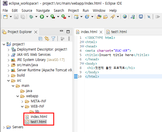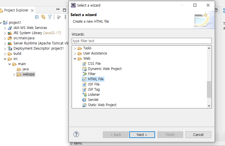 src 폴더 -> main -> webapp 오른쪽버튼 클릭 -> new -> other -> Web -> HTML file