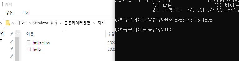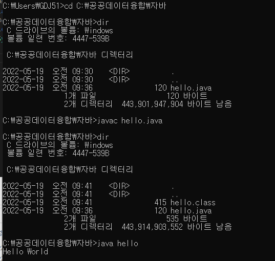 dir 디렉토리 확인 명령어, 그러면은 파일이 나옴, javac hello.java 하면은 컴파일러 되고, 폴더에 class가 생김