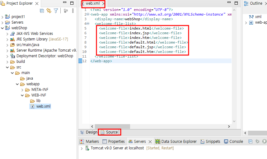 새로 프로젝트 생성하면은 .xml 생성됨, source를 보면은 처음실행되는 파일정보가 있음