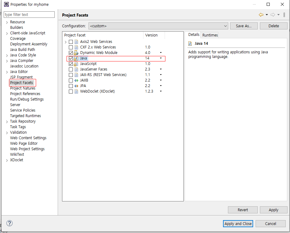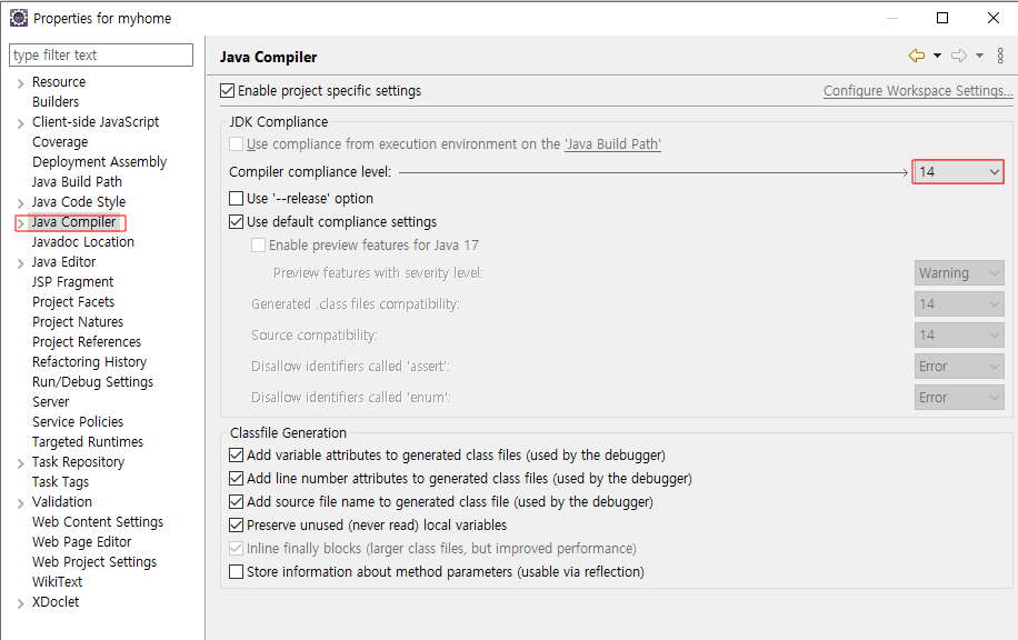 우리는 17로 생성되서 14로 변경함, 3군데 변경해야함(Java Build Path, Java Compiler, Project Facets)