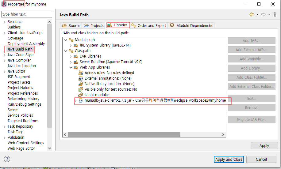 lib에 넣어주면 Bulid path쪽에도 파일이 들어가 있어야함