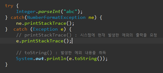 // printStackTrace() : 시스템에 현재 발생한 예외의 출력을 요청