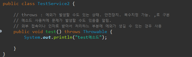 // throws : 예외가 발생할 수도 있는 상태. 안전장치. 복수지정 가능. ,로 구분