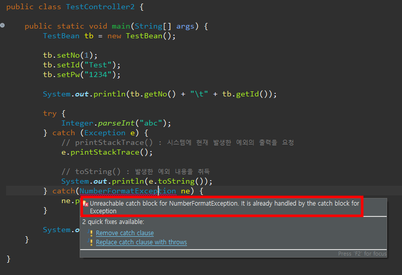 // throw : 뒤에 지정된 예외객체를 강제 발생, 왜 일부러 발생시키냐면은 자바는 오류를 발생시켜 분기점으로 사용하기 한다고, 오류