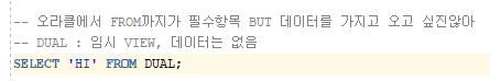 -- 오라클에서 FROM까지가 필수항목 BUT 데이터를 가지고 오고 싶진않아