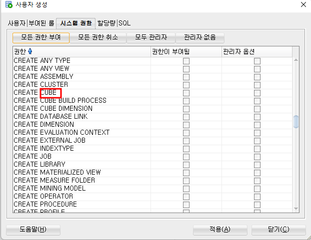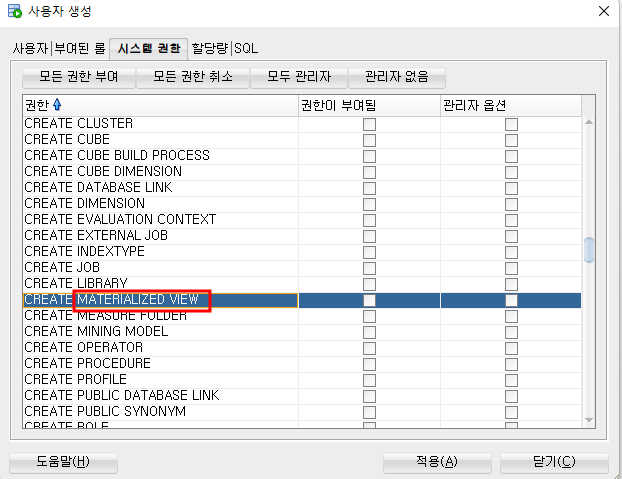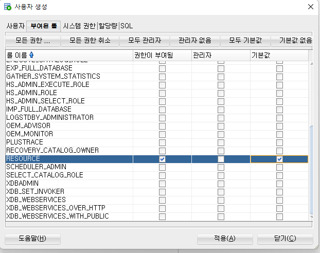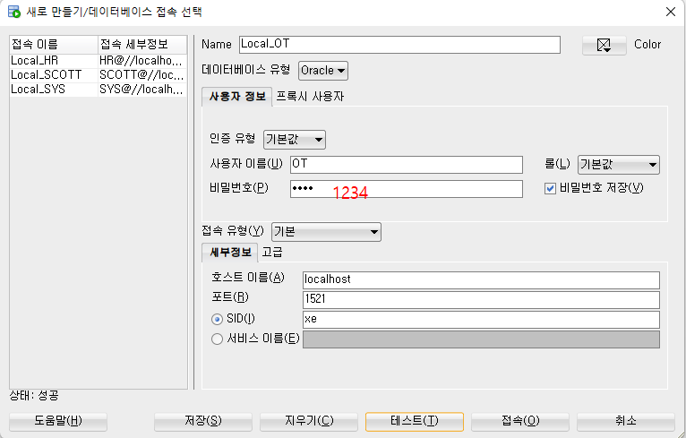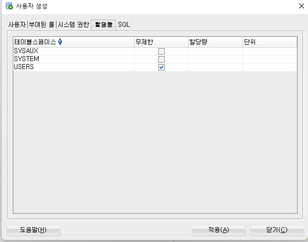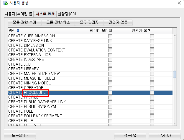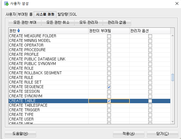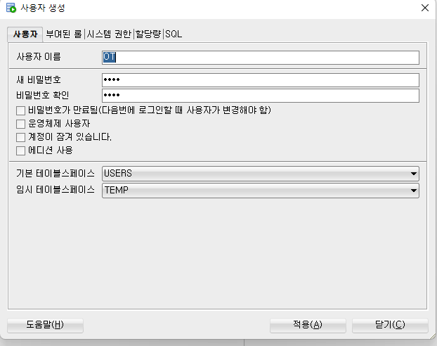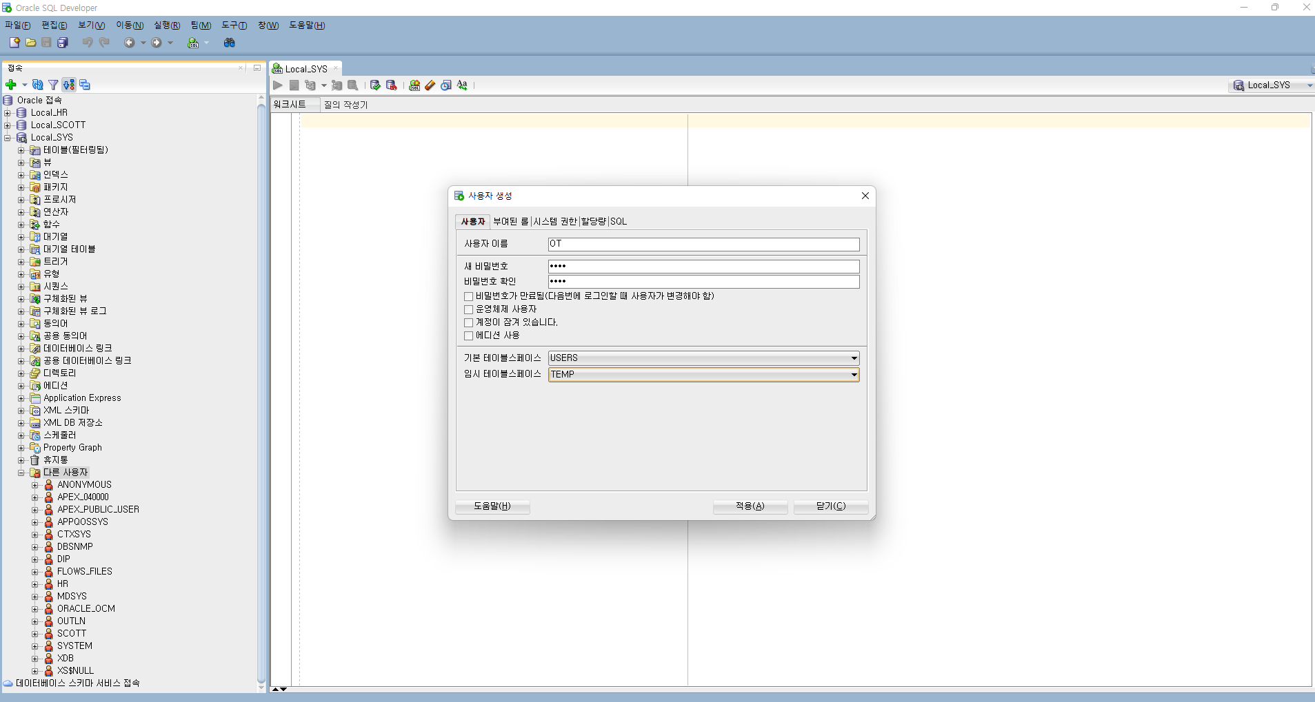 sys계정에서 다른사용자 왼쪽클릭 사용자 생성