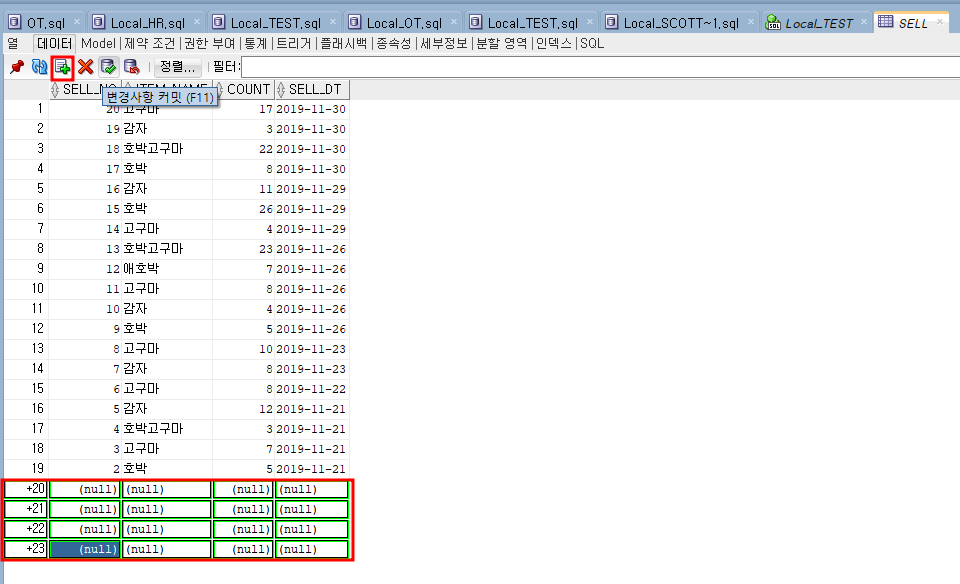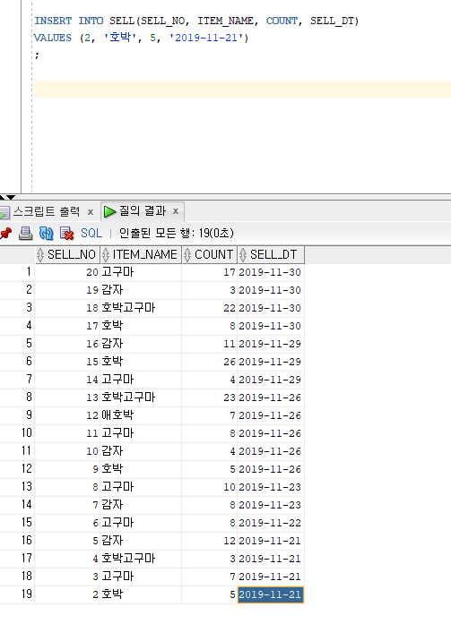 INSERT INTO SELL(SELL_NO, ITEM_NAME, COUNT, SELL_DT)