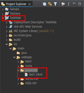 기존에 만들어놨던 TestWeb패키지에 javascript폴더 만들고 test1.html 파일 만듬