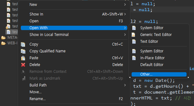 <script type="text/javascript"> // 따라서 script를 추가로 구현하려면 별도의 script태그를 선언해야함